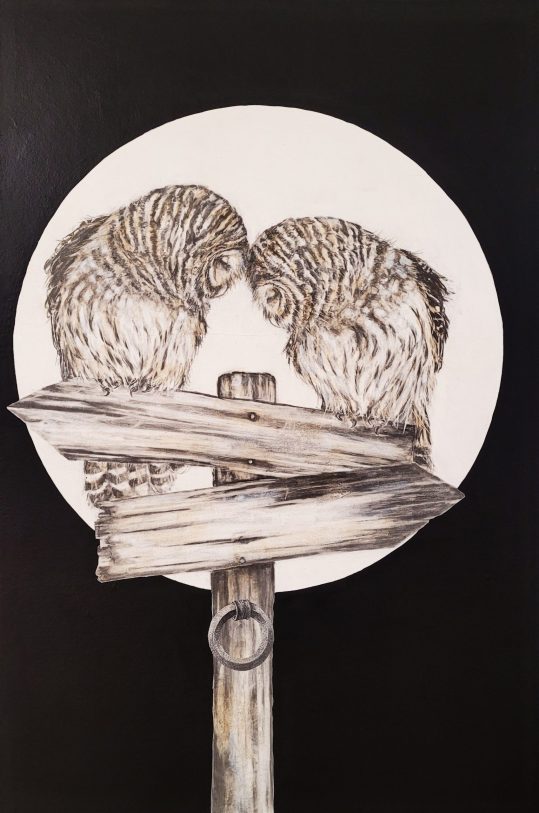 The use of metal leaf both in halos and background texture satisfies my love of the historical religious works that haunt my heart. Costume interests me, both for what it exposes and what it covers up. I continue to explore this through the work combining eras, or indulging in fantasy. Attention to hair styles and head gear are important to me as well. Certainly I recognize that the tools are in my hands, however, I do feel as though the figures in the work show up with their own agenda. I am committed to honouring that.